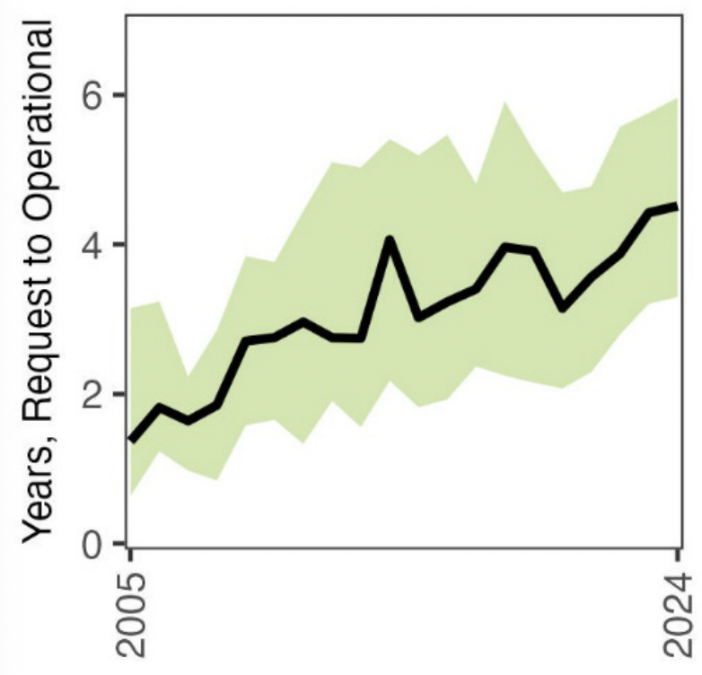 Of projects requesting grid interconnection between 2000 and 2019, only 19% had reached commercial operation by the end of 2024. The typical project built in 2024 spent 55 months between request and operation — up from 36 months in 2015 and 22 months in 2008.
